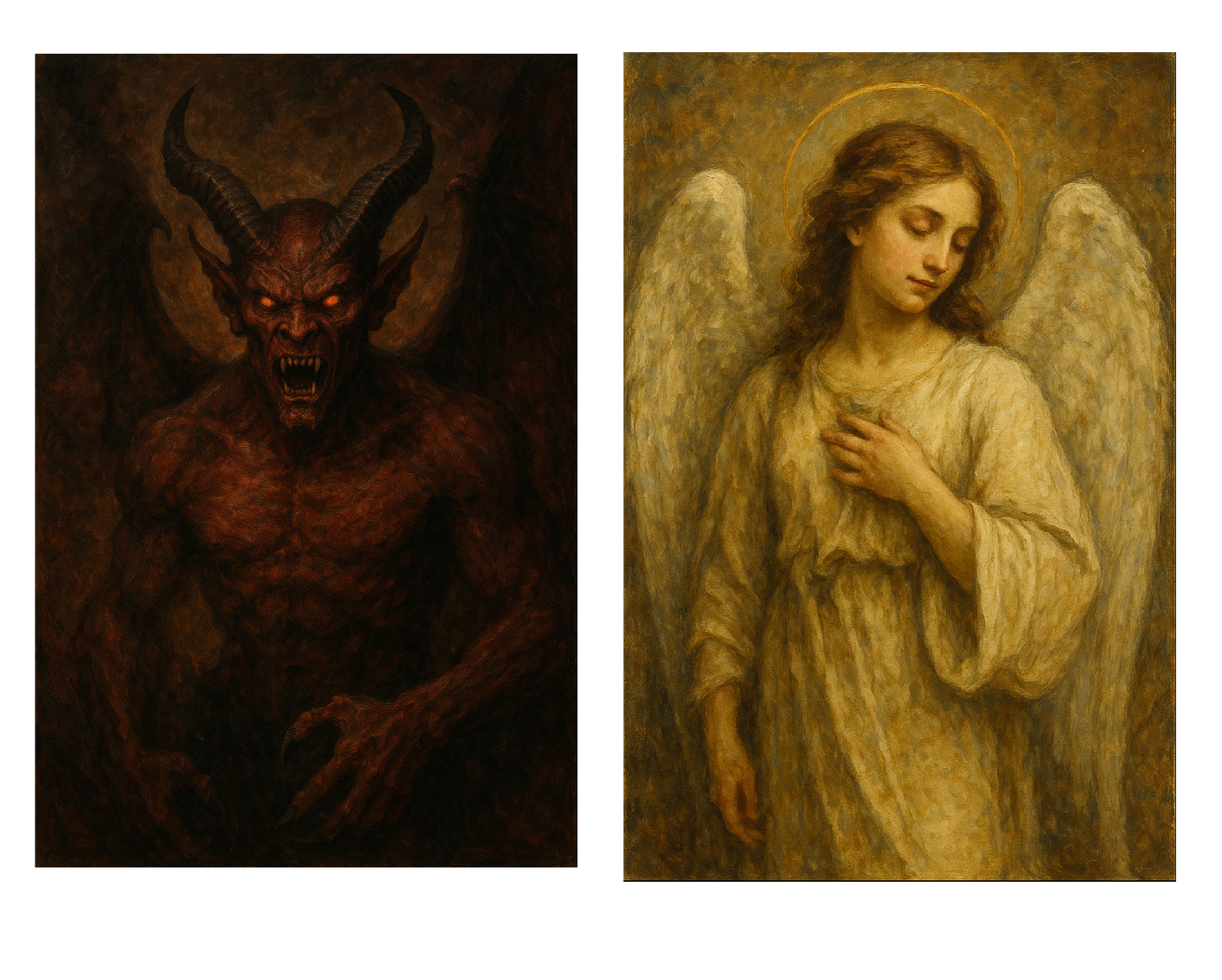 Note the color scheme on the two paintings: the devil painting automatically uses much darker colors, black and red, whereas the angel uses white and yellow, representing good. The AI is very good at capturing the respective moods that these two paintings should convey simply by the subjects they capture.