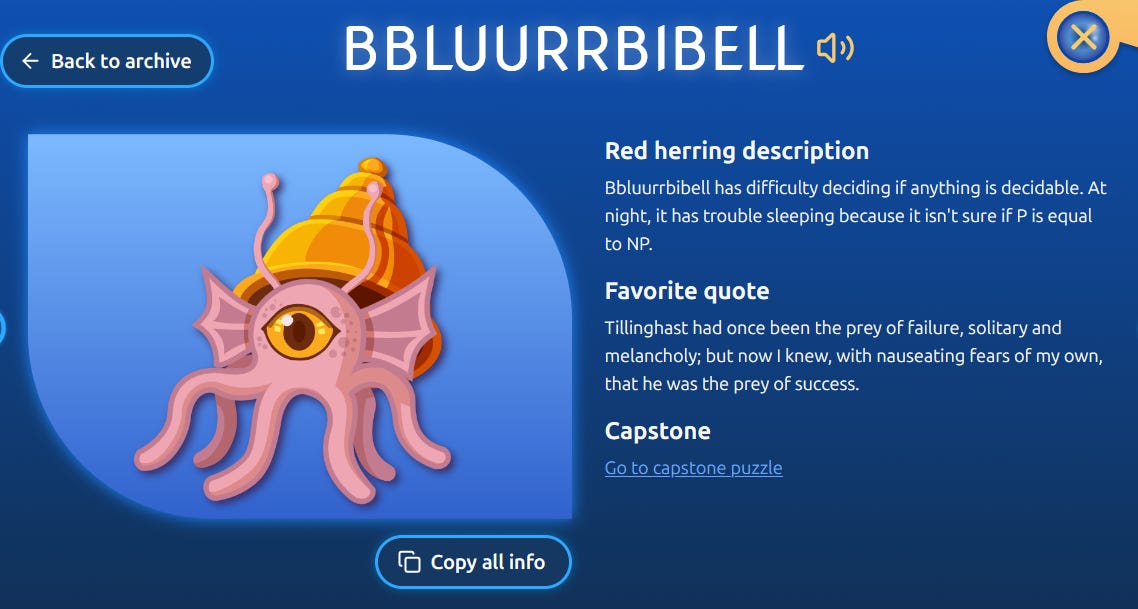 This leads us to why I said “plot” in scare quotes earlier. Unfortunately, I cannot praise the plot very much. Many characters disappear almost as soon as they are introduced, and many plot points are barely explained or are obviously only there to facilitate some aspect of the puzzlehunt. A plot that is just duct tape to hold the hunt together is hardly a plot at all. Given the great effort Cardinality spent on art and writing for this hunt, it would have been nice to see stronger storytelling.