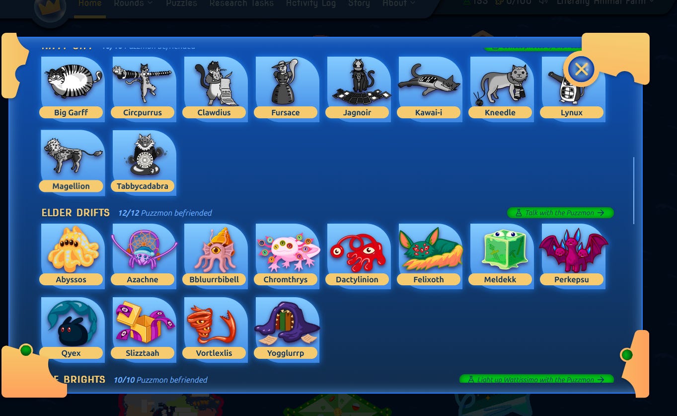 Once we had befriended over half of the Puzzmon in the Kingdom, a portal to a new dimension opened, unlocking a new round: The ▮▮▮▮ ▮▮ ▮▮ ▮▮M▮ . Sorry, I only worked on one puzzle in this round so only one letter of text is unlocked for me.