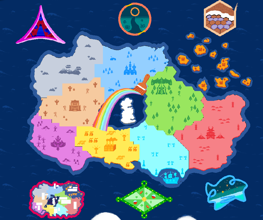 A nearly-full map of the Hunt. The main island is home to the Puzzmon kingdom, which has nine sections and a meta. Around it are the six dimension rounds.