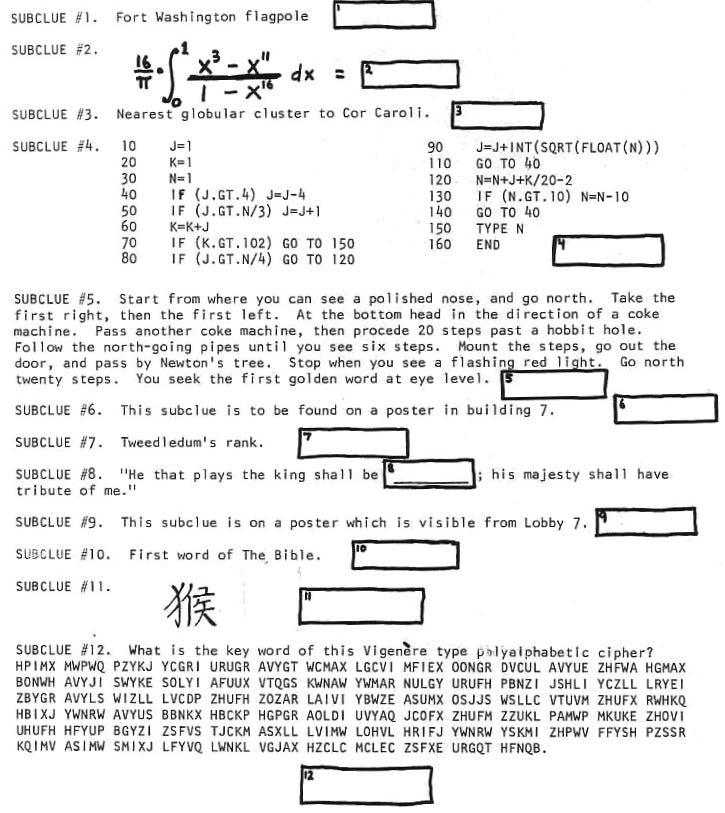 Looking at the page, my first thought is how trivial these puzzles are today. Putting aside campus-specific puzzles like #6, most of these are solvable by a novice in minutes— some, like #3 and #7, are one-shotted by Google.