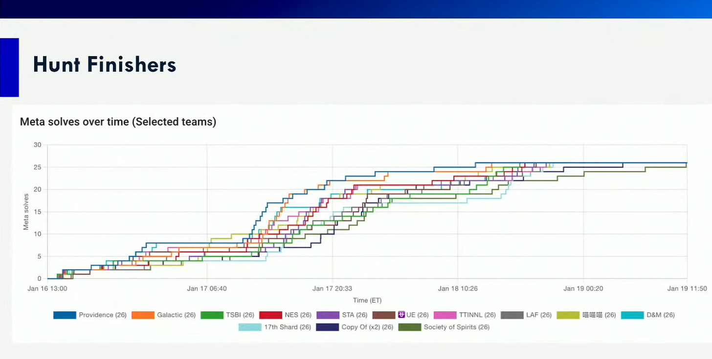 In preparing to write this post, I looked at Eric Berlin’s and Dan Katz’s posts on MITMH 2026. They both wrote that the hunt was too long. Berlin calls for a hunt short enough to allow “dozens of teams to cross the finish line”, as opposed to the 15 that actually did.