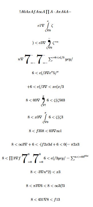You can see this by noticing how certain symbols are arranged in a way that implies mathematical logic if the symbols were slightly different. For example, at one point there is the integral operator, but in place of the true integral symbol there is a number seven. This tells us that the operative position of integration is being fulfilled by the number seven here. This is a really fun puzzle. In solving it, I assisted Adalbert Zollern, who dazzled me with his ability to untangle the symbols in mere minutes.