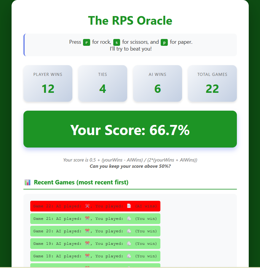 These are the rules the oracle uses for the first five games. If the oracle wins against a player, they’ll play what beats their last pick in order to counteract rule 1. If the oracle loses, it’ll play what beats the last player’s pick to take advantage of rule 2. These are both good strategies to choose if you win against casual RPS players.