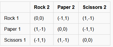 The first column represents Player 1’s choices, the first row represents Player 2’s. The first number in each cell represents the payoff for Player 1, the second number represents the payoff for Player 2. If you do the minmax on this table you’ll see that there’s no pure Nash equilibrium. For both players, all strategies are equivalent, which means the optimal strategy is to play each move 33% of the time at random. This is known as a mixed-strategy Nash equilibrium. If two rational players meet in a tournament, whoever wins their best-out-of-five match will be a matter of chance.